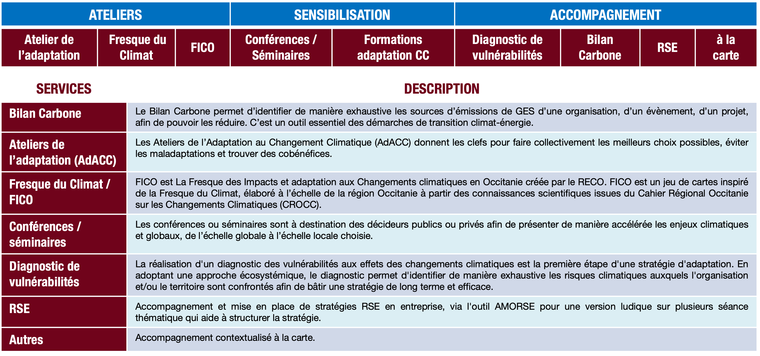 Ex. déploiement de formations, d’ateliers (FICO, AdACC…) et de méthodes (Bilan Carbone, diagnostics de vulnérabilités, accompagnement RSE…) etc.