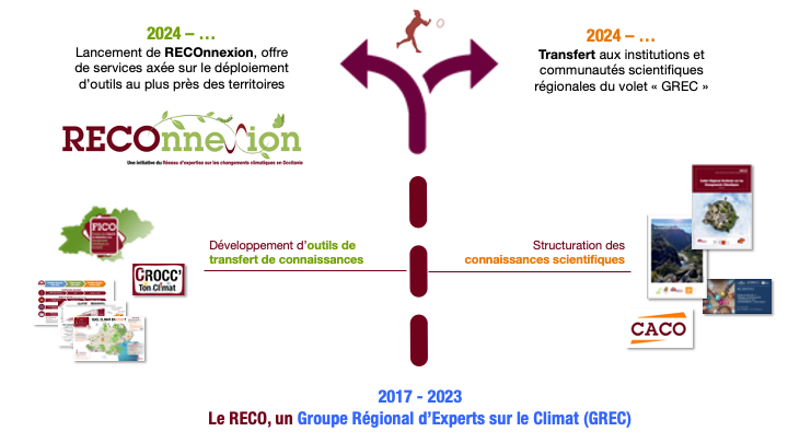 Fin 2017, le RECO est créé et devient le premier Groupe régional d’experts sur le climat (GREC) en Occitanie. Pendant six ans, le travail a consisté à rassembler les connaissances scientifiques, à tisser des liens avec des institutions et à développer des outils de sensibilisation (CROCC, FICO, CACO…). En 2024, le RECO transfère le volet scientifique au « GRECO », initiative pilotée par l’ADEME et la région Occitanie, et concentre son énergie sur son savoir-faire en termes de développement d’outils et d’accompagnement à l’échelle locale : c’est la naissance de Reconnexion.